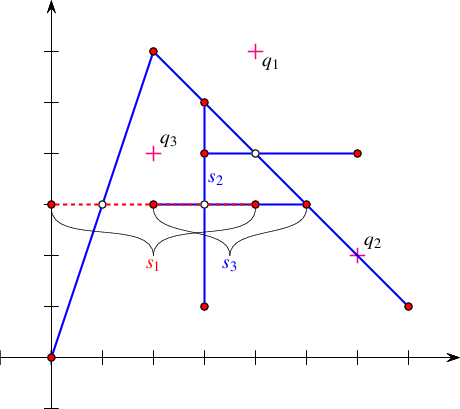 In the following example we construct a simple arrangement of six line segments, as depicted in Figure 34.46, while maintaining the curve history. Note that the input segments \(s_1\) and \(s_3\) overlap over two edges. The example demonstrates the usage of the special traversal functions. It also shows how to issue point-location queries on the resulting arrangement (the query points \(q_1\), \(q_2\), and \(q_3\) are drawn as crosses), using the auxiliary function locate_point() defined in the header file point_location_utils.h; see also Section Point-Location Queries.