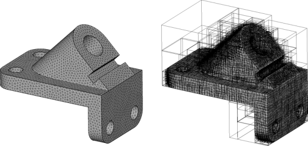 Figure 95.1 Left: surface triangle mesh of a mechanical part. Right: AABB tree constructed.