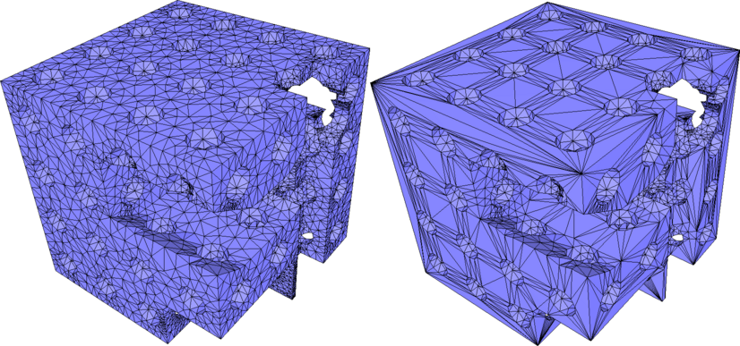 Figure 71.4 Remeshing of planar patches using region growing for the detection of planar patches. From left to right: input mesh, remeshed version, remeshed version using the same angle threshold but larger approximation error.