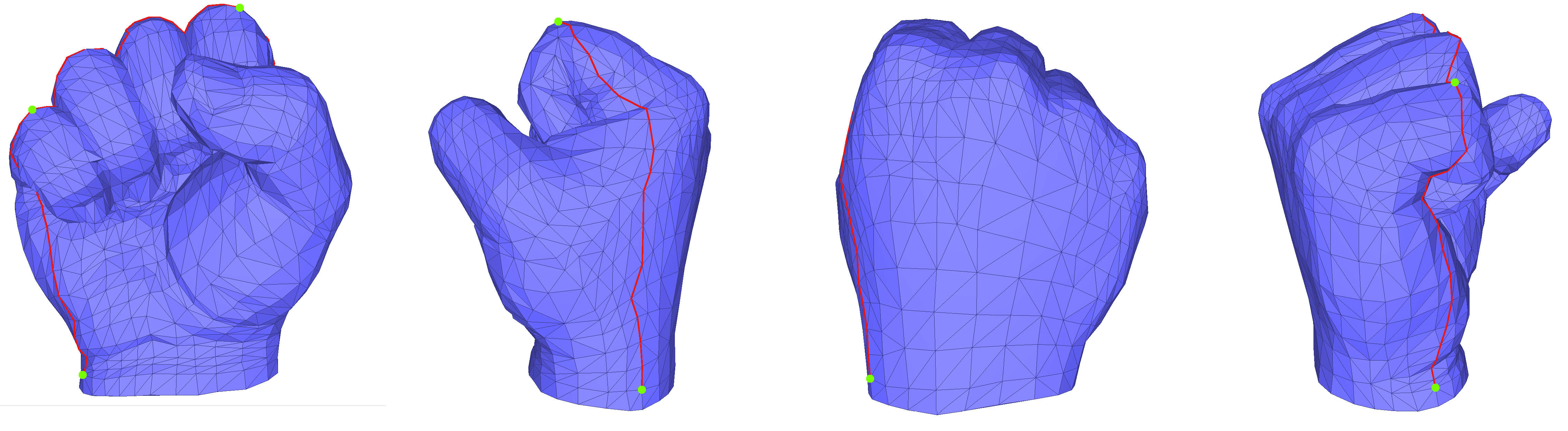Illustrations of the different methods are obtained with the same input model, the hand model, shown in Figure Figure 76.3. The hand is a topological sphere, and a Seam_mesh is used to cut it into a topological disk. In Figure Figure 76.3, the seam is traced in red and the four cones used for Orbifold Tutte Parameterization (Section Orbifold Tutte Embeddings) are marked with green dots.