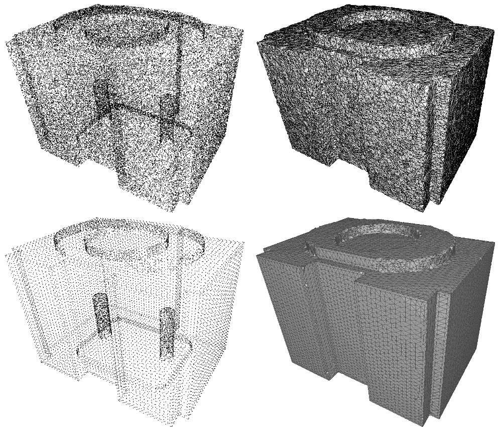 The quality of the reconstruction can be significantly improved thanks to point set structuring when dealing with shapes with sharp features, as shown on the previous figure. The following example shows how to define a priority functor that favors structurally coherent facets and makes the advancing front algorithm robust to sharp features.