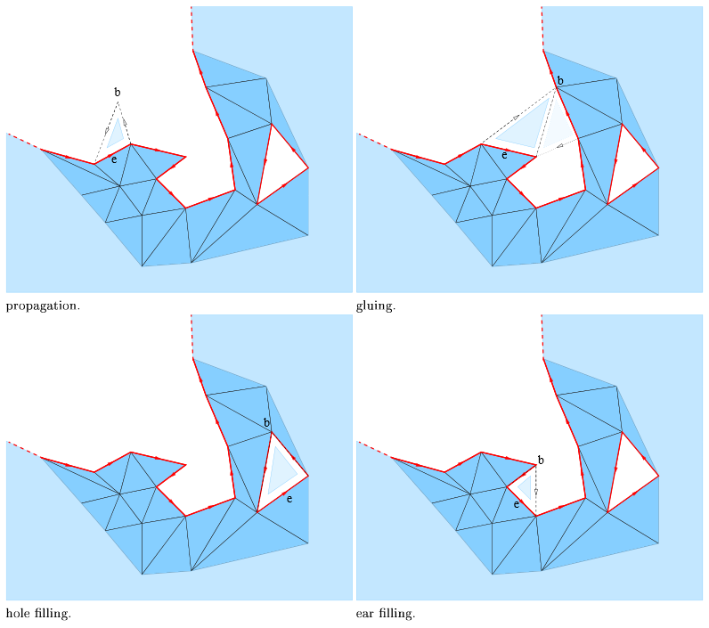 The algorithm maintains a priority queue of candidate triangles, that is of valid triangles incident to the boundary edges of the current surface. The priority is the plausibility. While the priority queue is not empty, the algorithm pops from the queue the most plausible candidate triangle and adds it to the surface. New candidate triangles are pushed to the priority queue when new boundary edges appear on the advancing front. As the algorithm creates a two-manifold surface some candidate triangles can not be selected due to topological constraints which are explained next.