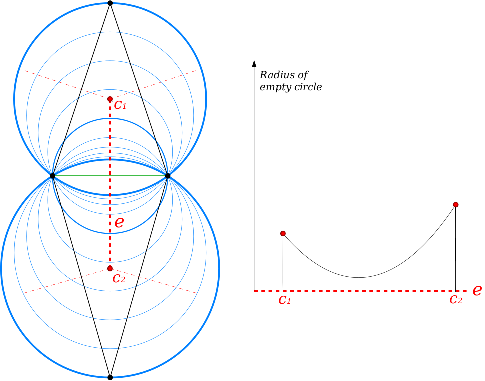 Figure 63.3 (Left) Pencil of empty circles (blue) circumscribing a Delaunay edge (green) in a 2D Delaunay triangulation (black). From the top triangle circumcenter c1 to the bottom triangle circumcenter c2, the dual Voronoi edge denoted by e (doted red) is the trace of centers of the largest circles that are empty of Delaunay vertex. (Right) The graph corresponding to the left example. The x-axis corresponds to the position of empty circle centers located on the Voronoi edge e, from c1 to c2. The y-axis is the radius value of the corresponding empty circles. In this case, the minimum radius of this pencil of empty circle is located at the midpoint of the green Delaunay edge. In our algorithm, a gate (green Delaunay edge) is said to be not alpha-traversable when the minimum radius of the pencil of empty circle is smaller than alpha.