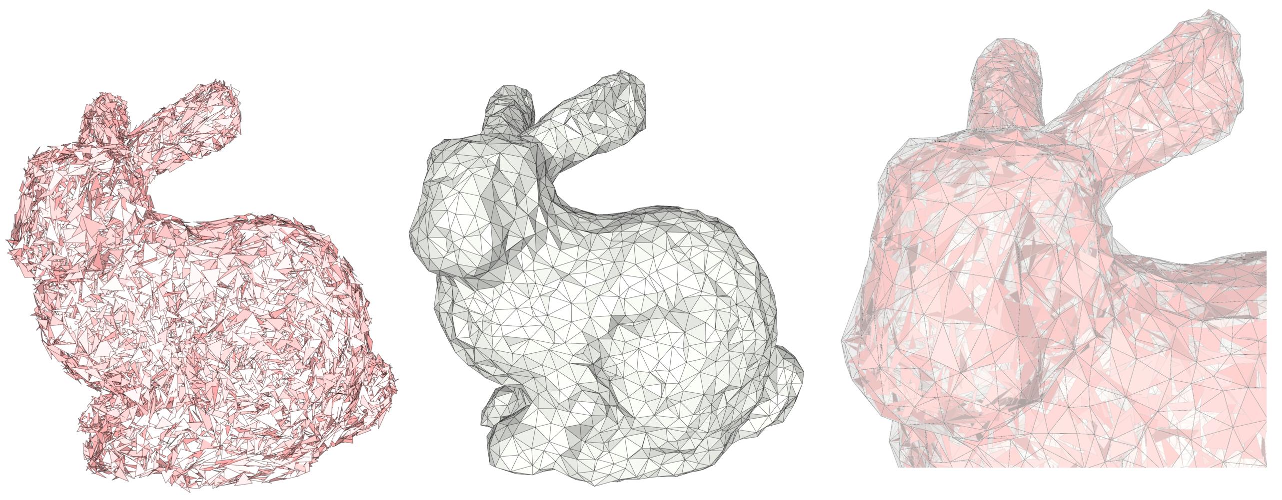 Figure 63.1 Shrink-wrapping output from a triangle soup, with many intersections and gaps. From left to right, input model, output wrap, and superposition.