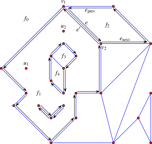An edge of an arrangement is a maximal portion of a curve between two vertices of the arrangement. Each edge is represented in the DCEL by a pair of twin halfedges. Each halfedge \(e\) stores a pointer to its incident face, which is the face lying to its left. Moreover, every halfedge is followed by another halfedge sharing the same incident face, such that the target vertex of the halfedge is the same as the source vertex of the next halfedge. The halfedges around faces form circular chains, such that all halfedges of a chain are incident to the same face and wind along its boundary. We call such a chain a connected component of the boundary, or CCB for short.