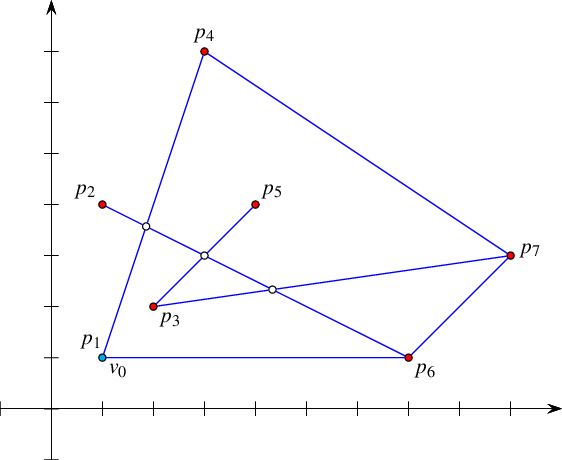 In the following example we construct an arrangement of seven line segments, as shown in Figure 35.49. Then, it uses the BGL generic implementation of Dijkstra's shortest-paths algorithm to compute the sum of squared distances to all vertices from the lexicographically smallest vertex \(v_0\) in the arrangement. Note the usage of the Arr_vertex_property_map class template in the call to boost::dijkstra_shortest_paths() and in the definition of the distance property-map. We instantiate a property map that attaches a number of type Number_type (which is a type of unlimited precision) to each vertex. The number represents the sum of squared distances of the vertex from \(v_0\).