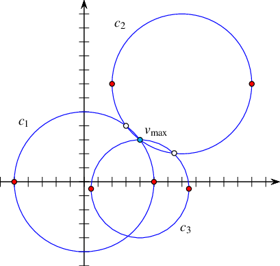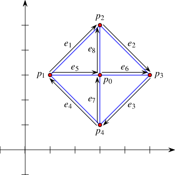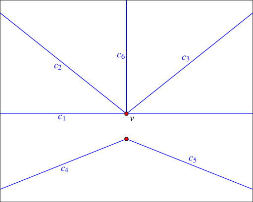 In our implementation we use a definition that slightly deviates from the standard definition above for practical reasons. The curves in \(\mathcal{C}\) can intersect each other (a single curve may also be self-intersecting or may comprise several disconnected branches) and are not necessarily \(x\)-monotone.A continuous planar curve \(c\) is \(x\)-monotone if every vertical line intersects it at most once. For example, a non-vertical line segment is always \(x\)-monotone and so is the graph of any continuous function \(y = f(x)\). For convenience, we treat vertical line segments as weakly \(x\)-monotone, as there exists a single vertical line that overlaps them. A circle of radius \(r\) centered at \((x_0, y_0)\) is not \(x\)-monotone, as the vertical line \(x = x_0\) intersects it at \((x_0, y_0 - r)\) and at \((x_0, y_0 + r)\). We construct a collection \(\mathcal{C}''\) of \(x\)-monotone subcurves that are pairwise disjoint in their interiors in two steps as follows. First, we decompose each curve in \(\mathcal{C}\) into maximal \(x\)-monotone subcurves and possibly isolated points, obtaining the collection \(\mathcal{C}'\). Note that an \(x\)-monotone curve cannot be self-intersecting. Then, we decompose each curve in \(\mathcal{C}'\) into maximal connected subcurves not intersecting any other curve (or point) in \(\mathcal{C}'\) in its interior. The collection \(\mathcal{C}''\) contains isolated points, if the collection \(\mathcal{C}'\) contains such points. The arrangement induced by the collection \(\mathcal{C}''\) can be conveniently embedded as a planar graph, the vertices of which are associated with curve endpoints or with isolated points, and the edges of which are associated with subcurves. It is easy to see that the faces of \(\mathcal{A}(\mathcal{C})\) are the same as the faces of \(\mathcal{A}(\mathcal{C}'')\). There are possibly more vertices in \(\mathcal{A}(\mathcal{C}'')\) than in \(\mathcal{A}(\mathcal{C})\)—the vertices where curves were cut into \(x\)-monotone (non-intersecting) pieces; accordingly there may also be more edges in \(\mathcal{A}(\mathcal{C}'')\). This graph can be represented using a doubly-connected edge list data-structure (DCEL), which consists of containers of vertices, edges and faces and maintains the incidence relations among these cells. It is one of a family of combinatorial data structures called halfedge data structures (Hds), which are edge-centered data structures capable of maintaining incidence relations among cells of, for example, planar subdivisions, polyhedra, or other orientable, two-dimensional surfaces embedded in a space of arbitrary dimension. Geometric interpretation is added by classes built on top of the halfedge data structure.