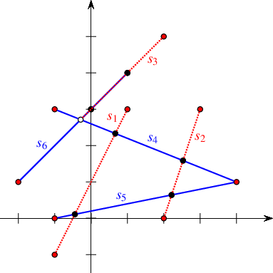 In the following example we construct a simple arrangement of six line segments, as depicted in Figure 35.46, while maintaining the curve history. Note that the input segments \(s_1\) and \(s_3\) overlap over two edges. The example demonstrates the usage of the special traversal functions. It also shows how to issue point-location queries on the resulting arrangement (the query points \(q_1\), \(q_2\), and \(q_3\) are drawn as crosses), using the auxiliary function locate_point() defined in the header file point_location_utils.h; see also Section Point-Location Queries.