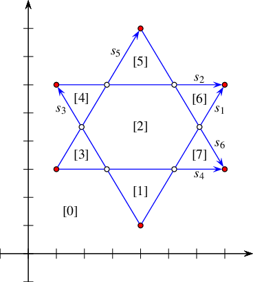 Figure 35.49 An arrangement of seven line segments, as constructed by Arrangement_on_surface_2/bgl_primal_adapter.cpp and Arrangement_on_surface_2/bgl_dual_adapter.cpp.
