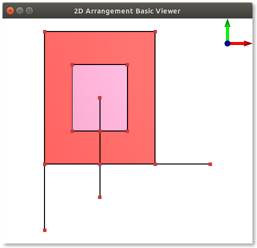 Figure 35.48 A snapshot of the window created by the program Arrangement_on_surface_2/draw_arr.cpp. The constructed arrangement consists of 14 vertices, 15 edges, and 3 faces. Notice that the colors are generated at random.