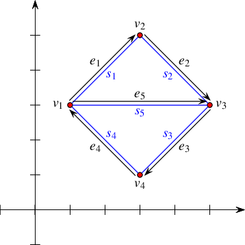 The program below demonstrates the usage of the four specialized insertion functions. It creates an arrangement of five line segments \(s_1, \ldots, s_5\), as depicted in Figure 35.4. Notice that in all figures in the rest of this chapter the coordinate axes are drawn only for illustrative purposes and are not part of the arrangement. The first line segment \(s_1\) is inserted in the interior of the unbounded face, while the four succeeding line segments \(s_2, \ldots, s_5\) are inserted using the vertices created by the insertion of preceding segments. The arrows in the figure mark the direction of the halfedges \(e_1, \ldots, e_5\) returned from the insertion functions. The resulting arrangement consists of three faces, where the two bounded faces form together a hole in the unbounded face.