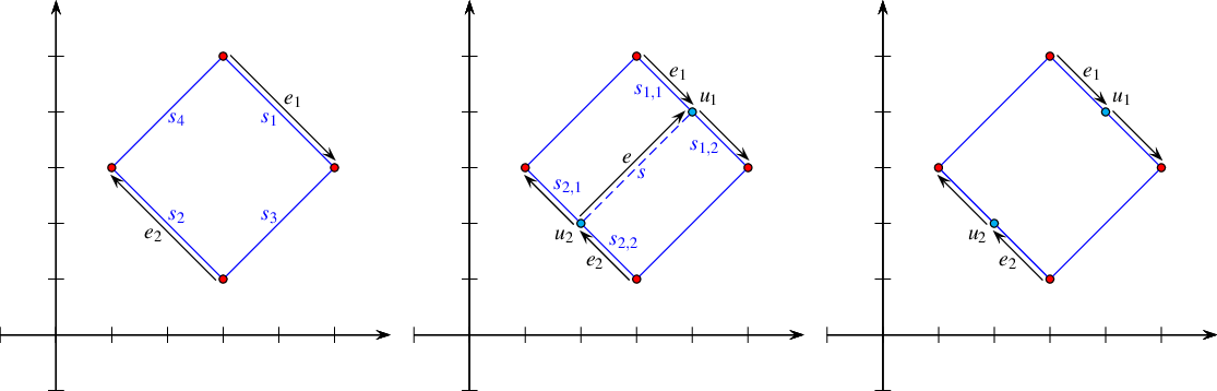 The following example program shows how the edge-manipulation functions can be used. The program works in three steps, as demonstrated in Figure 35.5. Note that the program uses the fact that split_edge() returns one of the new halfedges (after the split) that has the same direction as the original halfedge (the first parameter of the function) and is directed towards the split point. Thus, it is easy to identify the vertices \(u_1\) and \(u_2\) associated with the split points.