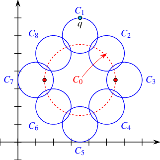 Figure 35.47 An arrangement with history of nine circles as constructed in Arrangement_on_surface_2/edge_manipulation_curve_history.cpp. Note the vertical tangency points of \(c_0\), marked as dark dots, which subdivide this circle into an upper half and a lower half, each consists of 9 edges. The large circle \(c_0\) is eventually removed from the arrangement, with all 18 edges it induces.