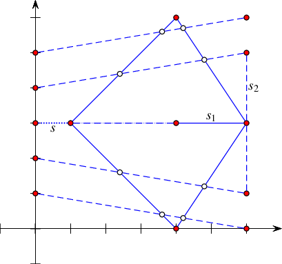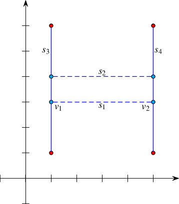 A new face, which is split from an existing arrangement face, is created (as is the case with the segment \(s_2\) in the figure below). In this case we also have to examine the holes and isolated vertices in the existing face and move the relevant ones inside the new face.