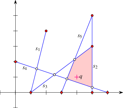 One of the most useful query types defined on arrangements is the point-location query: Given a point, find the arrangement cell that contains it. Typically, the result of a point-location query is one of the arrangement faces, but in degenerate situations the query point can lie on an edge, or it may coincide with a vertex.