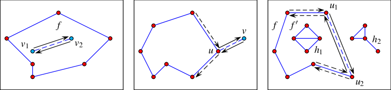 Figure 35.3 Illustrations of the various specialized insertion procedures. The inserted \(x\)-monotone curve is drawn as a dashed line, surrounded by two solid arrows that represent the pair of twin halfedges added to the DCEL. Existing vertices are shown as red discs, while new vertices are shown as blue discs. Existing halfedges that are affected by the insertion operations are drawn as dashed arrows. (a) Inserting a curve as a new hole inside the face \(f\). (b) Inserting a curve from an existing vertex \(u\) that corresponds to one of its endpoints. (c) Inserting an \(x\)-monotone curve, the endpoints of which correspond to existing vertices \(u_1\) and \(u_2\). In this case, the new pair of halfedges closes a new face \(f'\). The hole \(h_1\), which belonged to \(f\) before the insertion, becomes a hole in this new face.
