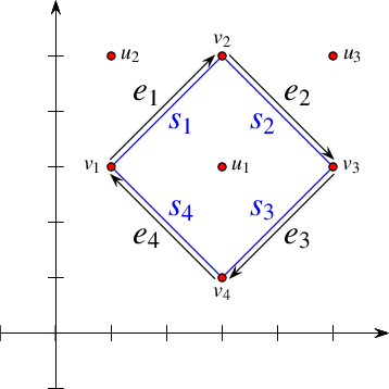 The following program demonstrates the usage of the arrangement member-functions for manipulating isolated vertices. It first inserts three isolated vertices, \(u_1\), \(u_2\), and \(u_3\), located inside the unbounded face of the arrangement. Then, it inserts four line segments \(s_1, \ldots, s_4\), that form a square hole inside the unbounded face (see Figure 35.4 for an illustration). Finally, it traverses the vertices and removes those isolated vertices that are still contained in the unbounded face ( \(u_2\) and \(u_3\) in this case):