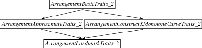 The Traits template-parameter should be substituted by a model of the ArrangementBasicTraits_2 concept and optionally additional geometry traits concepts. A model of the ArrangementBasicTraits_2 concept defines the types of \(x\)-monotone curves and two-dimensional points, namely ArrangementBasicTraits_2::X_monotone_curve_2 and ArrangementBasicTraits_2::Point_2, respectively, and supports basic geometric predicates on them. The instantiated traits class determines the family of planar curves that induce the arrangement.