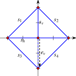 The member functions modify_vertex() and modify_edge() modify the geometric mappings of existing features of the arrangement. The call arr.modify_vertex(v, p) accepts a handle to a vertex \(v\) and a reference to a point \(p\), and sets \(p\) to be the point associated with the vertex \(v\). The call arr.modify_edge(he,