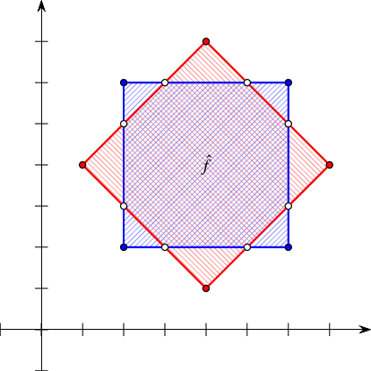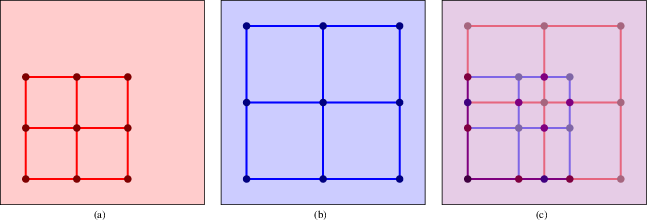 The example program listed below computes the overlay, depicted in Figure 35.45, of the two arrangements depicted in (a) and (d). Each feature of the input arrangements and of the overlay arrangement is extended with an RGB color stored as an unsigned int. The vertices, halfedges, and faces of the red arrangement are assigned three different shades of red. Similarly, the vertices, halfedges, and faces of the blue arrangement are assigned three different shades of blue. Using an instance of the Overlay_color_traits class template as the overlay traits, each feature of the overlay arrangement is assigned a color that is a blend of the colors attached to the inducing features.