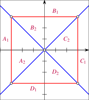 The next example, depicted in Figure 35.44, demonstrates the face overlay of two arrangements that have unbounded faces as well as bounded ones. The first arrangement (blue) is induced by the two lines \(y = x\) and \(y = -x\), which subdivide the plane into four unbounded faces, labeled \(A\), \(B\), \(C\) and \(D\). The second arrangement (red) comprises four line segments that form a square-shaped face indexed \(1\). The unbounded face is indexed 2. When the two arrangements are overlaid, each of the four faces \(A\), \(B\), \(C\) and \(D\) is split into an unbounded face (indexed 2) and a bounded face (indexed 1), so the faces of the resulting arrangement are labeled \(A_1, A_2, \ldots, D_1,