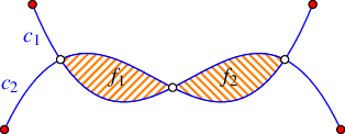 Geometric arrangements, or arrangements for short, are subdivisions of some space induced by geometric objects. Figure 35.1 shows an arrangement of two curves \(c_1\) and \(c_2\) in the plane. It has three faces—two bounded faces \(f_1\) and \(f_2\) (filled with diagonal-stripe patterns) and an unbounded face. The arrangement has seven vertices—four represent the endpoints of \(c_1\) and \(c_2\) (drawn as small discs), and three represent the intersection points of the two curves (drawn as small rings). The arrangement also has eight edges, each of which is a maximal portion of one curve not intersecting the other.