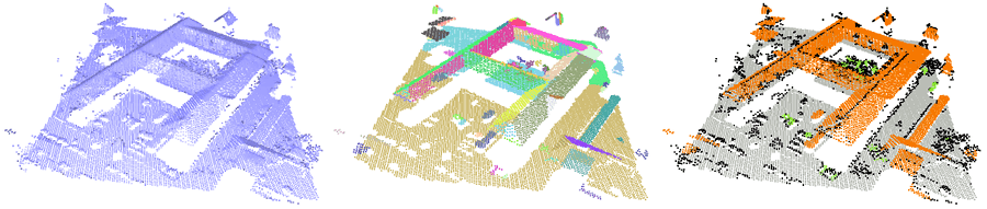Figure 87.4 Example of cluster classification mesh (left: input, middle: clusters computed from region growing, right: output). Ground is grey, roofs are orange, vegetation is green, points not assigned to a cluster are black.