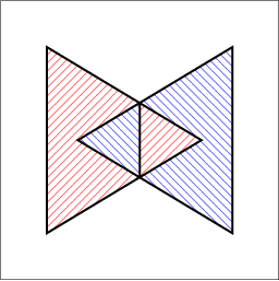 Figure 39.2 (a) Two triangles in \( {\mathbb R}^3\), as given in envelope_triangles.cpp. (b) Their lower envelope. (c) Their upper envelope.