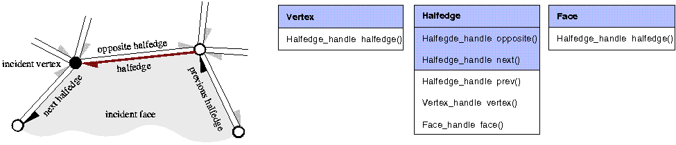 A halfedge is an oriented edge between two vertices. It is always paired with a halfedge pointing in the opposite direction. The opposite() member function returns this halfedge of opposite orientation. The next() member function points to the successor halfedge along the face - or if the halfedge is a border halfedge - along the open region. A halfedge optionally stores a reference to the previous halfedge along the face, a reference to an incident vertex, and a reference to an incident face. Type tags indicate whether the related member functions are supported. Figure figureHalfedgeDSOptionalMethods depicts the relationship between a halfedge and its incident halfedges, vertices, and faces.
