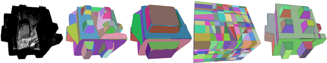 From left to right: 1. input point cloud with 382k points 2. 98 detected planar shapes 3. 63 regularized convex shapes 4. kinetic space partition with 1,487 cells 5. reconstructed polygonal mesh with 131 faces.
