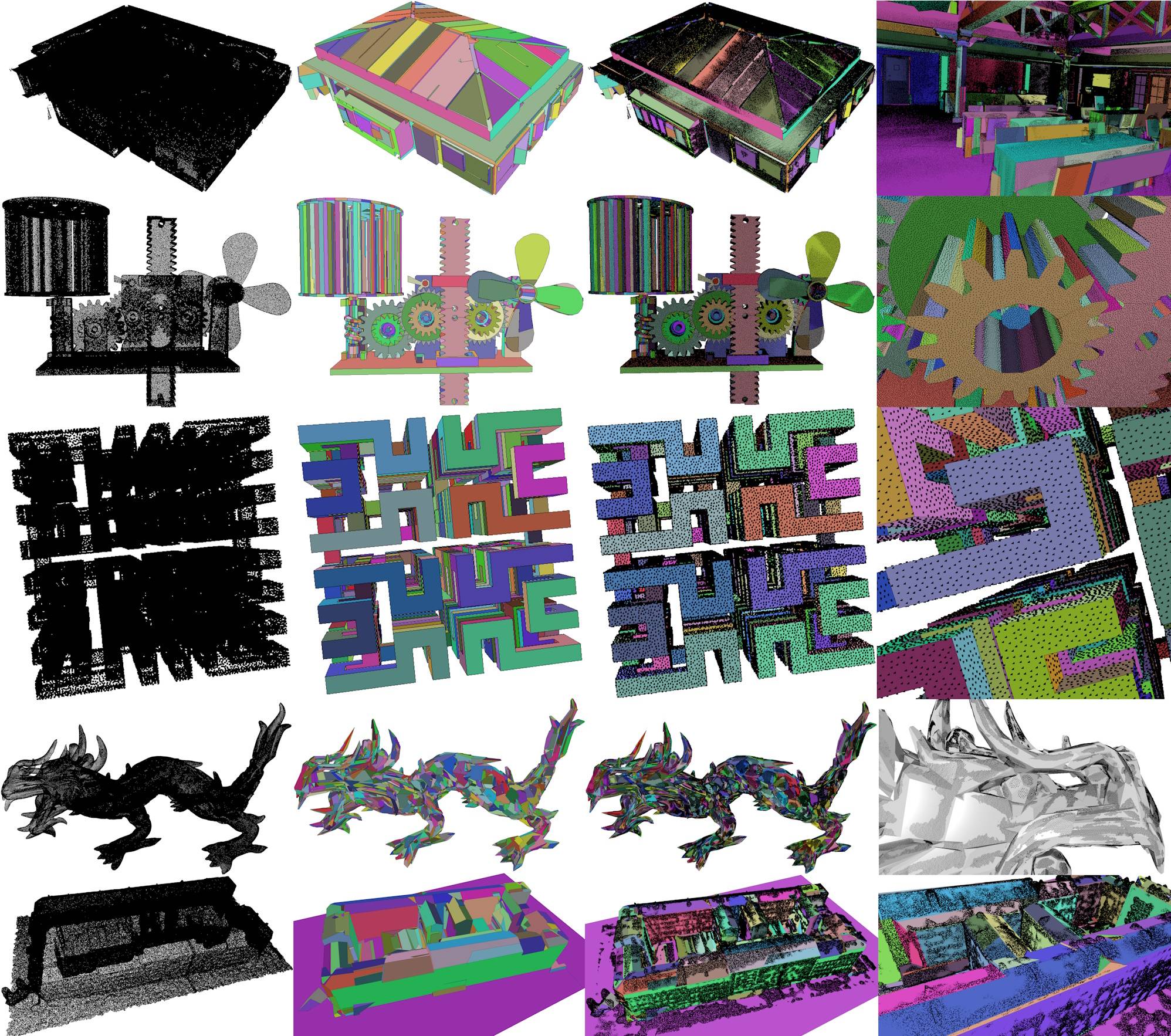 Kinetic surface reconstruction is aimed at reconstructing piece-wise planar objects, e.g., man-made objects and architecture. Reconstruction results on point clouds acquired from architecture in different qualities are shown in figure Figure 69.3 in the first and last row. Synthetic point clouds from a CAD model and a fractal object are shown in rows 2 and three. The datasets used here are available at https://files.inria.fr/titane/KSR42_dataset.zip.