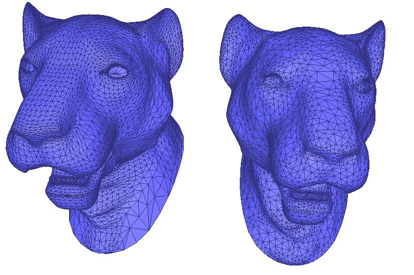 Figure 60.11 View of a remeshed surface. (Left) input mesh (Right) output mesh. Code from subsection Remeshing a Polyhedral Surface generates the file.