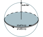 We discuss how sfaces, shalfedges, and sloops belong to the shells with a closeup view of the situation at the antenna foot. As you can see, there are three items on the sphere map - a shalfloop for each halffacet which intersects the sphere, and an svertex where the antenna intersects the sphere. The upper shalfloop lies on the halffacet which is oriented outwards and is therefore also oriented outwards. This shalfloop and the svertex belong to the second shell. The other shalfloop lies on the inwards oriented halffacet and is oriented inwards, too. This shalfloop belongs to the third shell.