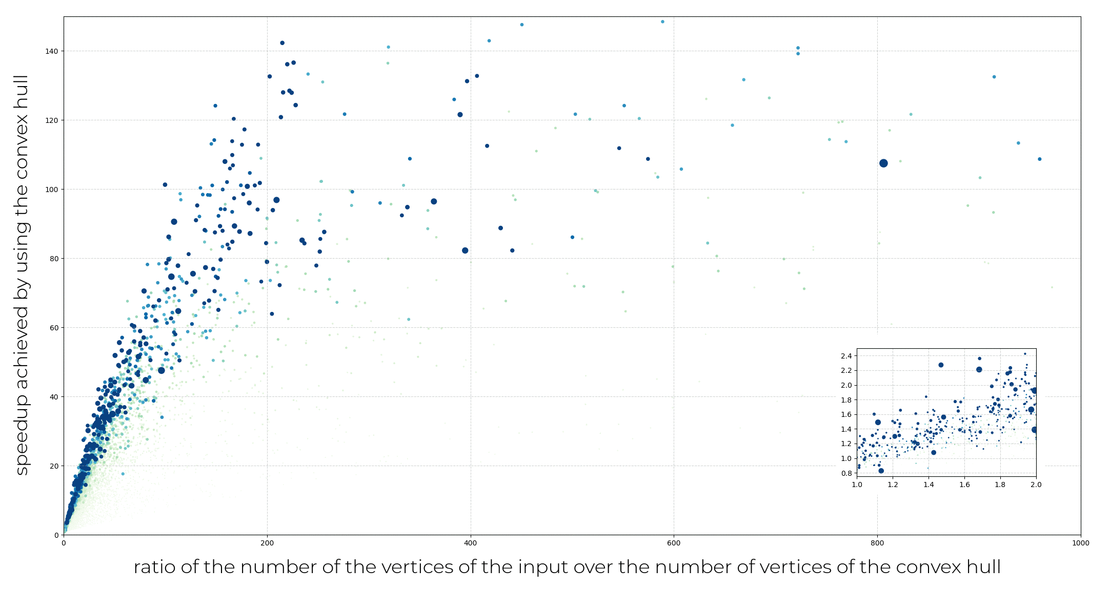 Figure 102.3 Computation of the speedup achieved on the total runtime of the algorithm when the convex hull is computed and used afterwards. Note that the total runtime includes the construction of the convex hull (when it is used). The color and size of the dots represent the number of vertices in the input data (larger, bluer points having more input vertices than greener, smaller points). Computing the convex hull is beneficial for all but a handful of cases.
