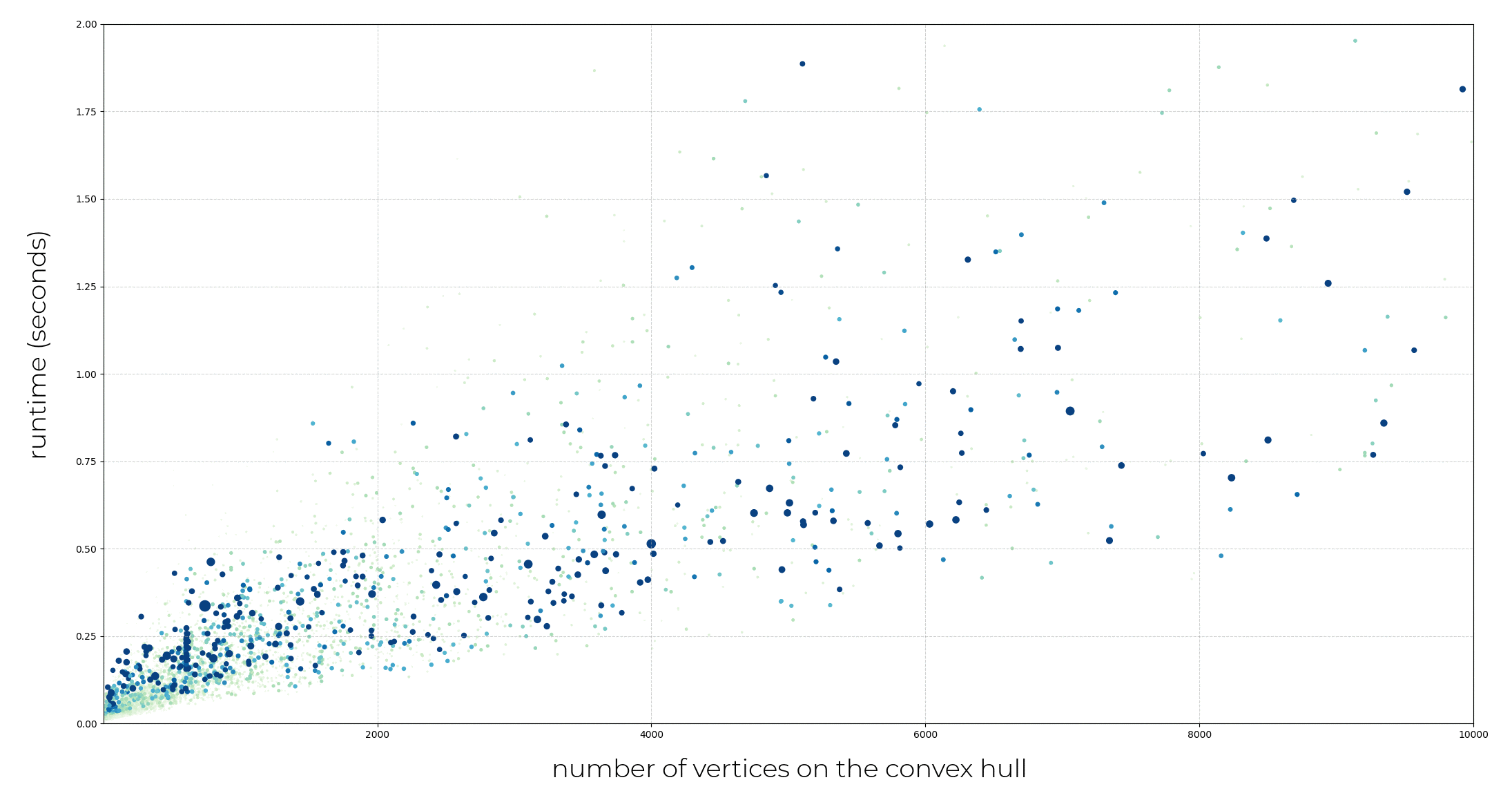 Figure 102.4 Running times for the oriented bounding box construction of the convex hull of models of the Thingi10k data set. The color and size of the dots represent the number of vertices in the input data (larger, bluer points having more input vertices than greener, smaller points). The algorithm exhibits linear complexity in practice. For visibility reasons, the few models whose convex hull has more than 10000 vertices are excluded from this graph, but consistent results are observed.