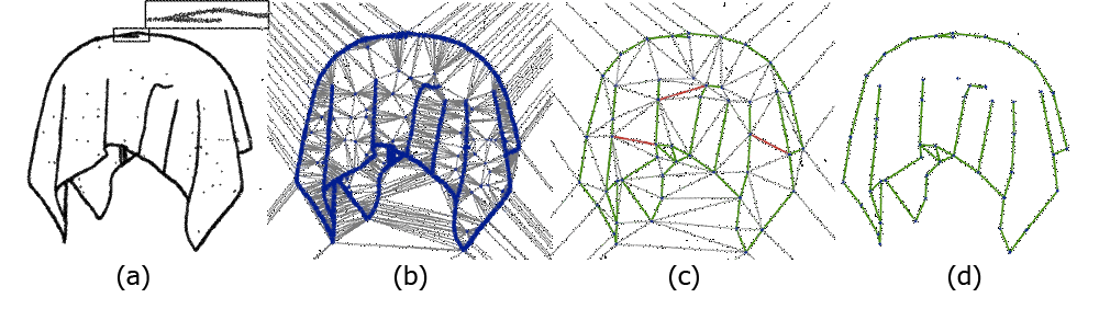 Figure 70.2 (a) Input points. (b) Delaunay triangulation of the input points. (c) After simplification, with ghost edges in grey, relevant edges in green, and irrelevant edges in red. (d) Final reconstruction made up of several edges and one isolated vertex.