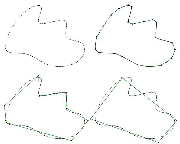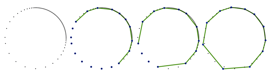 Figure 70.3 Examples of 20-vertex reconstructions from datasets consisting of 2000, 400 and 200 input points respectively. These examples illustrate the behavior of the algorithm when the input point density decreases.
