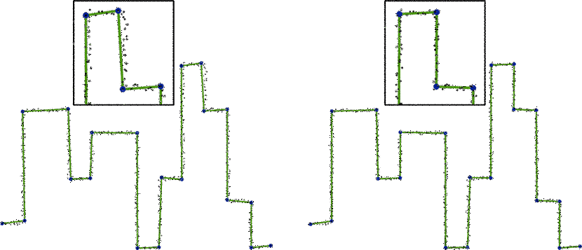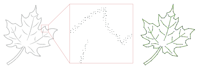 Figure 70.1 Left: input point set hampered by noise. Right: The corresponding reconstructed shape consisting of line segments.