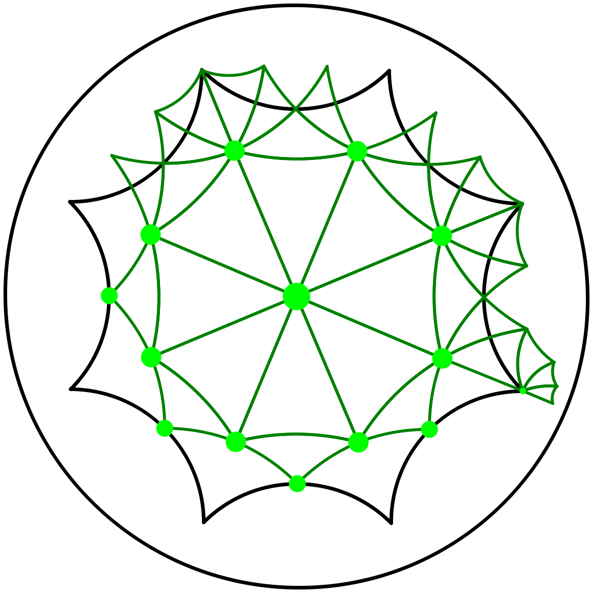 Figure 45.6 Delaunay triangulation of \(\mathcal M\) defined by the 14 dummy points. The set \(\mathcal Q\) of dummy points contains the origin, the vertex of \(\mathcal D\), the midpoints of the closed sides of \(\mathcal D\), and the (hyperbolic) midpoints of the segments between the origin and the vertices of the octagon.