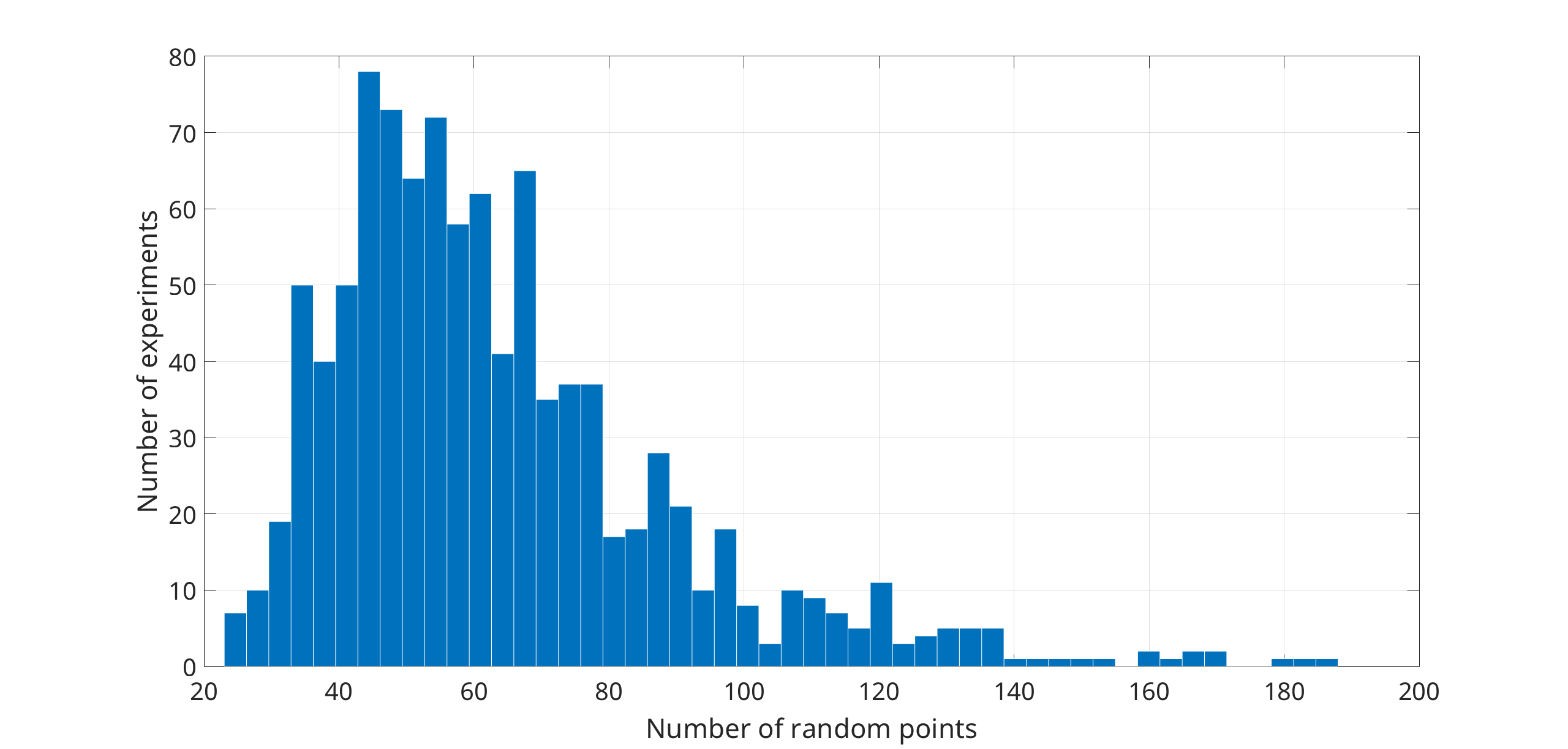 Figure 45.7 Histogram of the number of random input points needed to remove all dummy points in a triangulation of the Bolza surface. The histogram shows results acquired from 1000 executions of the experiment described above. In these 1000 executions, the minimum number of random points needed to remove all dummy points was 23, the maximum 188, and on average 64 random points were needed.