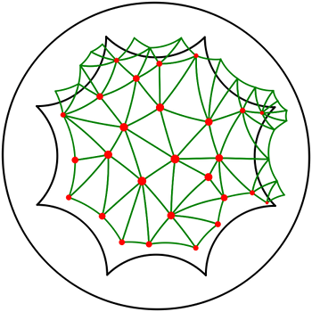 The example below shows the initialization of a periodic hyperbolic 2D Delaunay triangulation, the insertion of random points uniformly distributed in the unit disk for the Euclidean metric, and the properties of the triangulation after the insertion. It uses the default triangulation data structure.