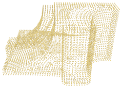 The scale-space surface reconstruction has lenient ideal conditions. The surface should be reasonably regularly sampled and it should not contain overly concave corners. These notions affect the neighborhood parameter in opposing ways: more regular sampling may admit a smaller neighborhood parameter, which will admit smaller concavities. The point set may contain noise that is significantly smaller than the neighborhood size. Even so, when using the method to construct a mesh interpolating the original point set, any noise will deform the mesh. Figure 65.5 shows a reconstruction under ideal conditions.
