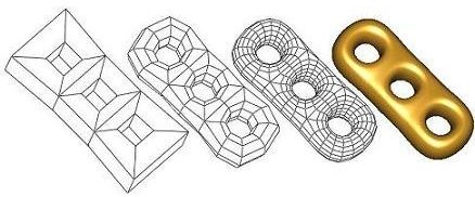 A subdivision method recursively refines a coarse mesh and generates an ever closer approximation to a smooth surface. The coarse mesh can have arbitrary shape, but it has to be a 2-manifold. In a 2-manifold, every interior point has a neighborhood homeomorphic to a 2D disk. Subdivision methods on non-manifolds have been developed, but are not considered in Subdivision_method_3. The chapter teaser shows the steps of Catmull-Clark subdivision on a CAD model. The coarse mesh is repeatedly refined by a quadrisection pattern, and new points are generated to approximate a smooth surface.