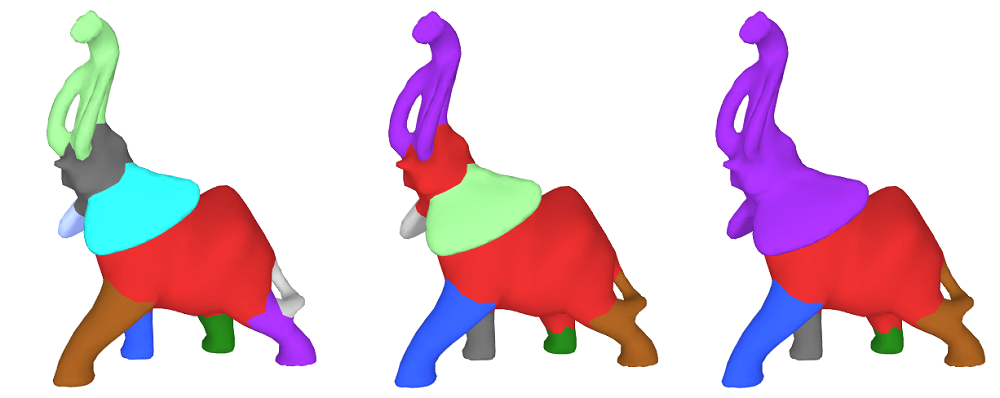 Assigning a high value to the smoothness parameter results in a small number of segments (since constructing a segment boundary would be expensive). In other words, merging facets that are placed under different clusters is less expensive than separating them and creating boundaries. On the contrary, assigning smaller values to smoothness parameter results in a high number of segments, by getting closer to the result of the soft clustering (notice that setting \( \lambda=0 \) provides the result of the soft clustering). Figure 73.4 depicts the influence of the smoothness parameter.