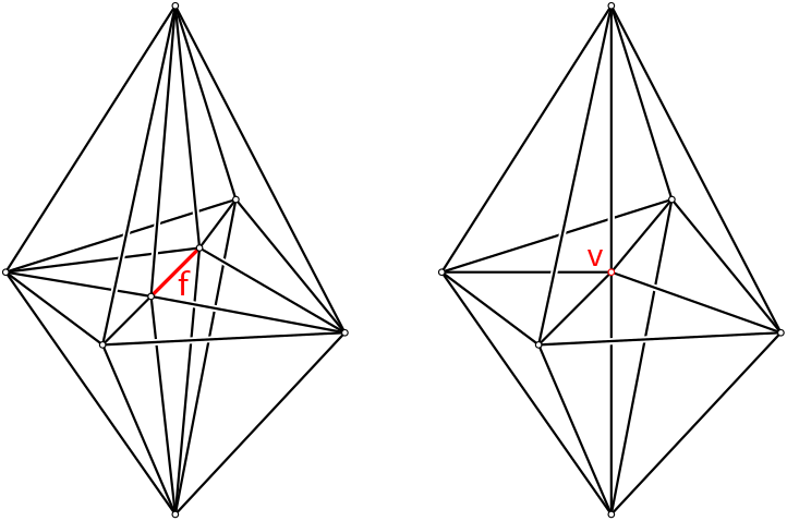 v is used to triangulate one of the two half-spheres of \( \mathbb{S}^{d+1}\) ( \( v\) is added as \( (d+2)^{th}\) vertex to all full cells) and star is used to triangulate the other half-sphere (all full cells that do not already have star as vertex are duplicated, and star replaces v in these full cells). The indexing of the vertices in the full cell is such that, if f was a full cell of maximal dimension in the initial complex, then (f,v), in this order, is the corresponding full cell in the updated triangulation. A handle to v is returned (see Figure Figure 49.5).