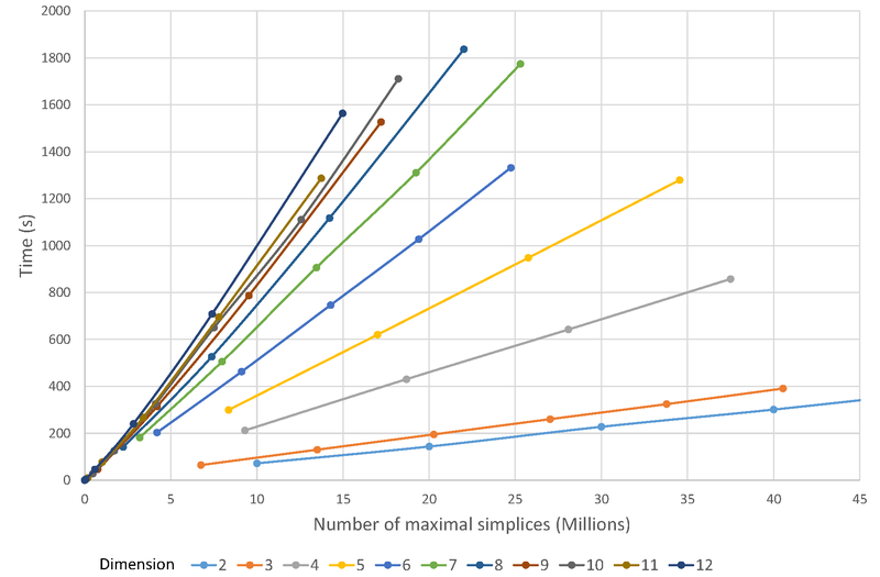 Figure 49.5 Running time wrt. number of maximal simplices, for dimensions for 2 to 12.