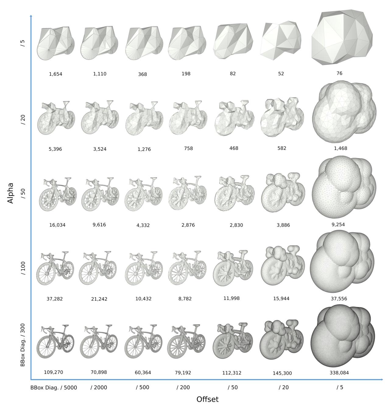 Figure 67.8 Different alpha and offset values on the bike model (533,000 triangles). The x-axis represents the offset value equal to 1/5000, 1/2000, 1/500, 1/200, 1/50, 1/20 and 1/5 of the longest diagonal of the input bounding box, from left to right. The y-axis represents the alpha value equal to 1/300, 1/100, 1/50, 1/20 and 1/5 of the longest diagonal of the input bounding box, from bottom to top. The numbers below each level of detail represents their number of triangles. Depending on the alpha value, an offset too small or too large will produce output mesh with higher complexity. For each alpha, the models with lower complexity can be used as a scale-space representations for collision detection, from near to far distances.
