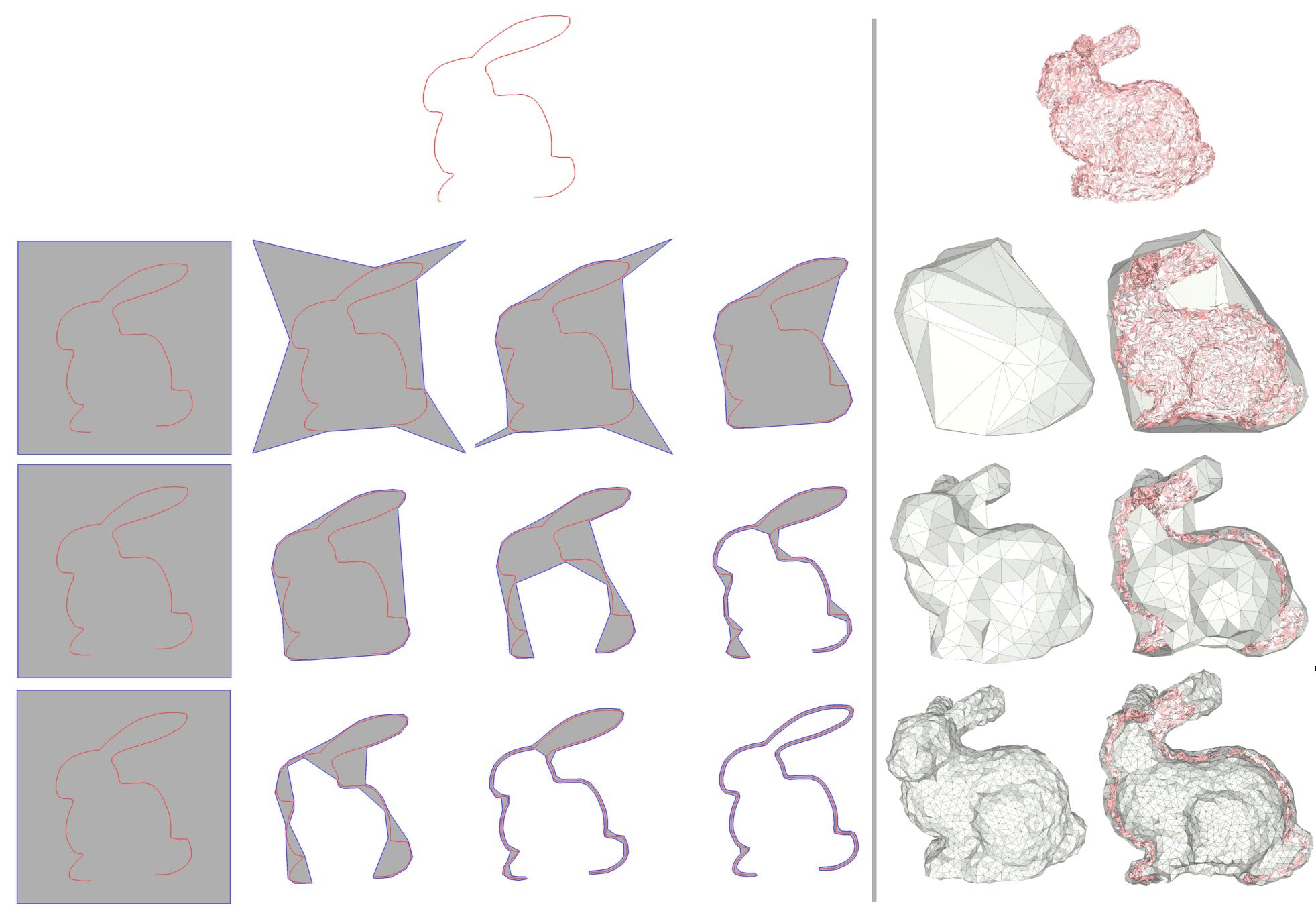 Figure 67.9 Two-sided wrap. (Left) Wrapping a Bunny in 2D, with decreasing values for alpha. (Right) Wrapping a defect-laden Bunny in 3D. The rightmost column depicts a clipped visualization of the inside. When alpha is small enough with respect the diameter of the holes, the algorithm generates a two-sided wrap.