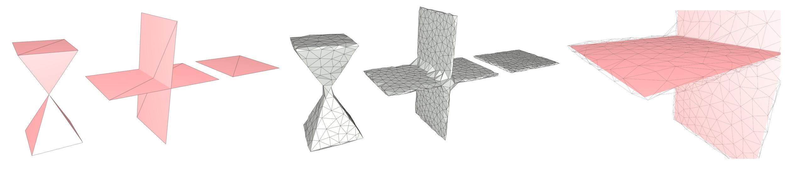 Figure 67.2 Dealing with non-manifold features and degeneracies. From left to right, a non-manifold vertex, self-intersecting faces and two adjacent triangles representing a zero-volume structure. The algorithm handles these cases by wrapping an offset of the input.