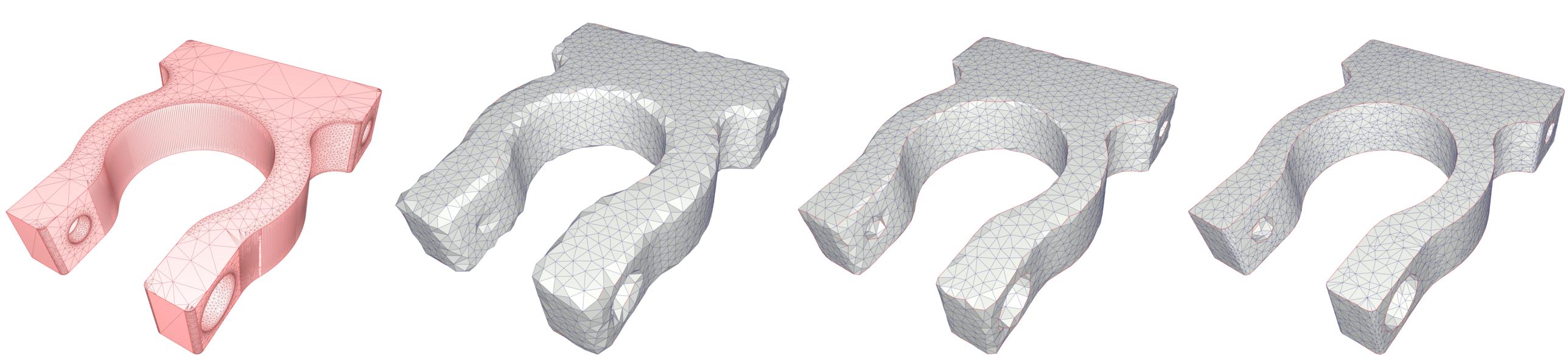 Figure 67.6 Impact of the offset parameter on the output. (Left) Input mesh generated by meshing a NURBS CAD model in parameter space. (Right) The smaller the offset, the closest sample points are to the input. The offset parameter is decreasing from left to right, to respectively 1/50, 1/200 and 1/1000 of the longest diagonal of the input bounding box. The alpha parameter is equal to 1/50 of the longest diagonal of the input bounding box for all level of details. A larger offset will produce an output less complex with better triangle quality. However, the sharp features (red edges) are well-preserved when the offset parameter is small.
